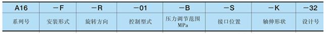 系列号:图示“A16”表示为该系列油泵的系列号(A系列油泵具有多个系列号对应不同几何排量及工作压力,见下表)